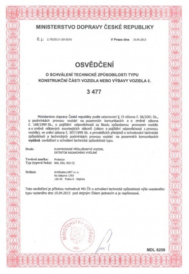 Antiradar Protector získal ATEST Ministerstva dopravy ČR.