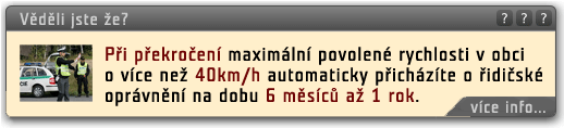 | Překročení rychlosti o 40 km/h v obci, o 50 km/h mimo obec | Nelze řešit na místě | 7 000 - 25 000 + zákaz řízení |